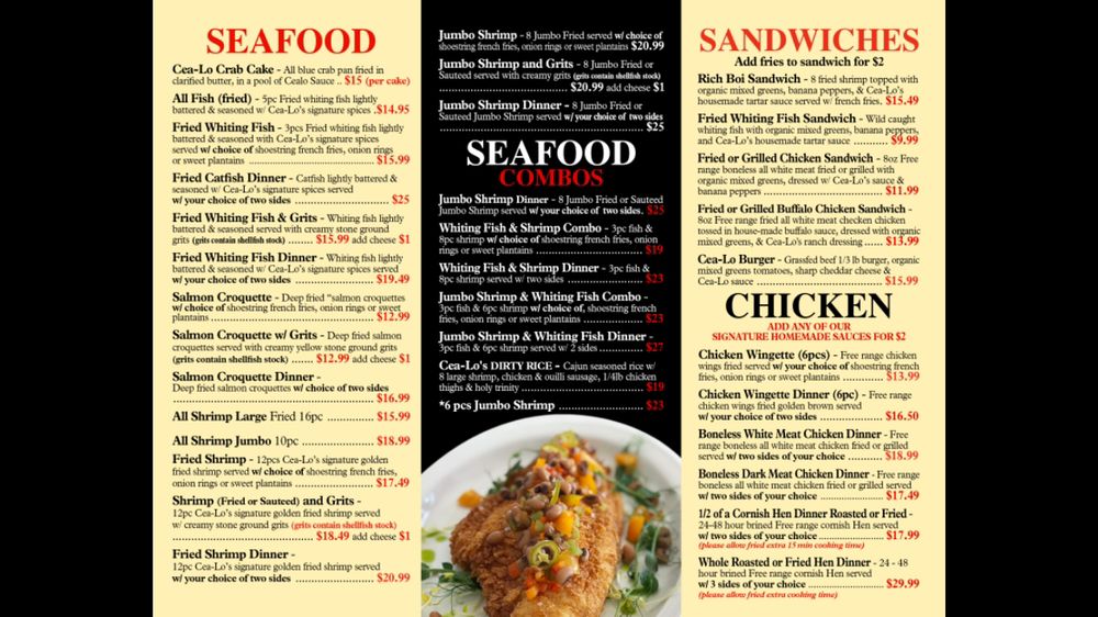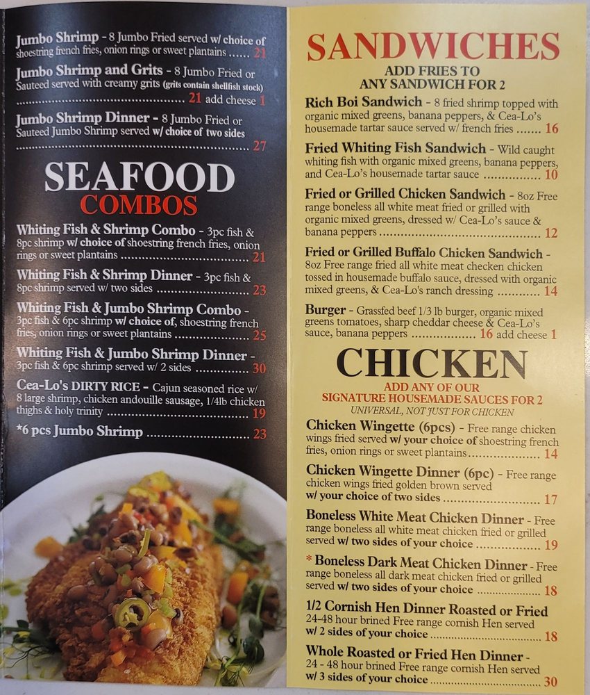 Cea-Lo L.A is a Soul Food, New American, and Seafood restaurant located in Sherman Oaks, CA. With a diverse menu offering vegan options and happy hour specials, this black-owned establishment provides a welcoming atmosphere for all. Customers rave about the generous portions and flavors of dishes like catfish, mac & cheese, hush puppies, and fried shrimp. The friendly staff and knowledgeable chef ensure a top-notch dining experience. Highlights include fresh food, special sauces, great ambiance, and must-try items like the Crab Cake. While some dishes may need more seasoning, the overall quality and value are exceptional. Cea-Lo L.A is a hidden gem worth a visit for delicious soul food and outstanding service.
